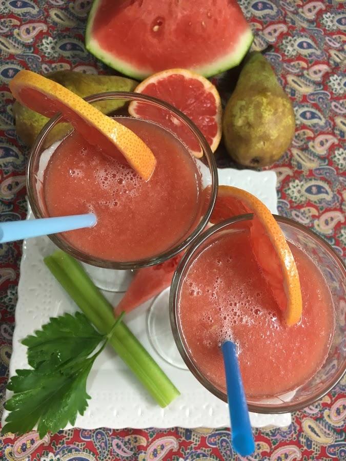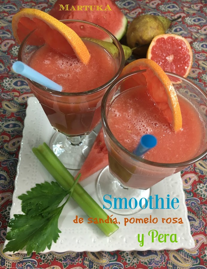 Se pone en el vaso de la batidora (o en la lucuadora) con el zumo de pomelo y la cucharada de miel todas las frutas y el apio. Se bate enérgicamente hasta que quede con la textura deseada.