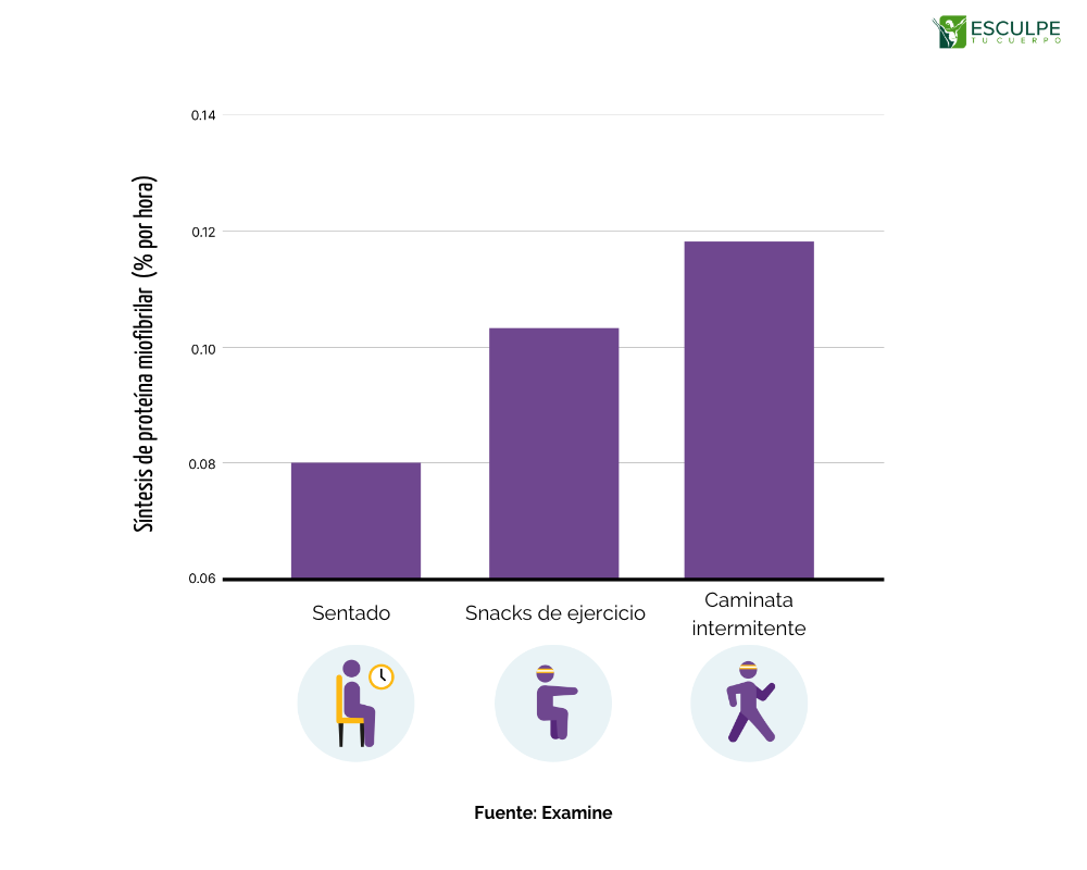 Otro estudio reciente29 evaluó los efectos de la interrupción de la sedestación (estar sentado por mucho tiempo) en la síntesis de proteína muscular.