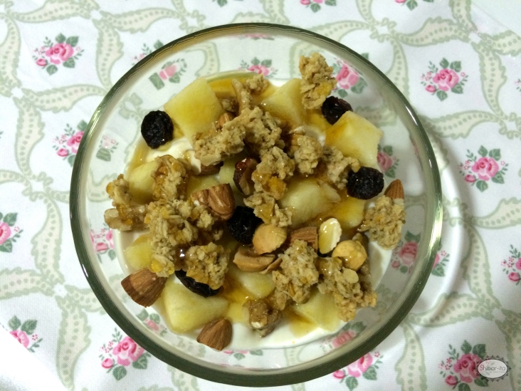 Ingredientes: Queso fresco batido 0% M.G., 1 cucharadita de café de aroma de vainilla, 1 manzana, muesli, mix de frutos secos (avellanas, nueces, pasas, almendras), miel