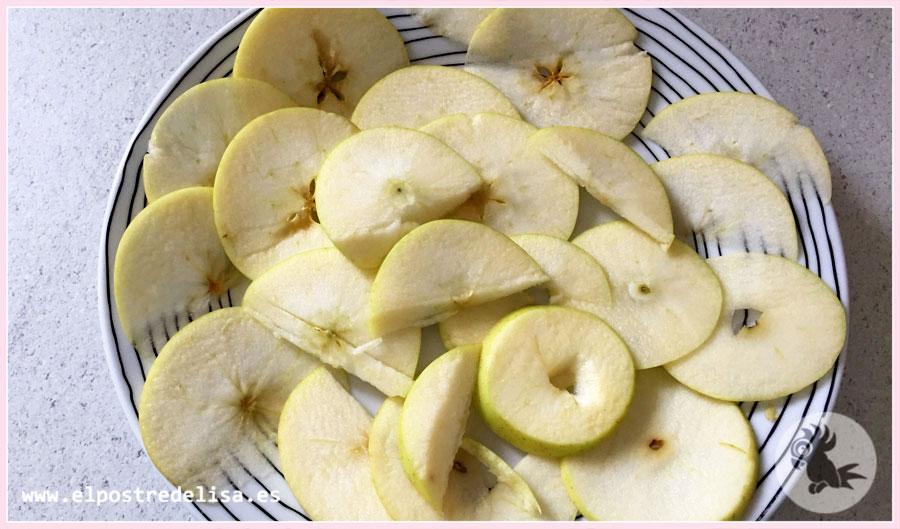 Primero se parte la manzana en rodajas, cuanto más finas más crujientes quedarán.