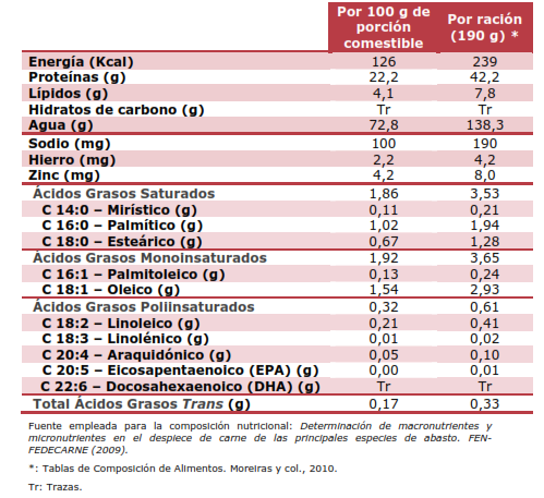 En cuanto a sus propiedades nutricionales, este corte posee un valor calórico moderadamente bajo. Su contenido en grasa es igualmente bajo y su aporte de proteína es elevado valor biológico. Es una de las piezas más magras y tiernas. De esta carne destaca, especialmente, su aporte de hierro, que junto con la aguja, es una de las zonas de la carne de la canal más rica en este mineral. También es una carne con alto contenido en zinc y moderado en sodio. Es una carne ideal para preparaciones a la parrilla o a la plancha, fundamentalmente aunque también se emplea para asar.