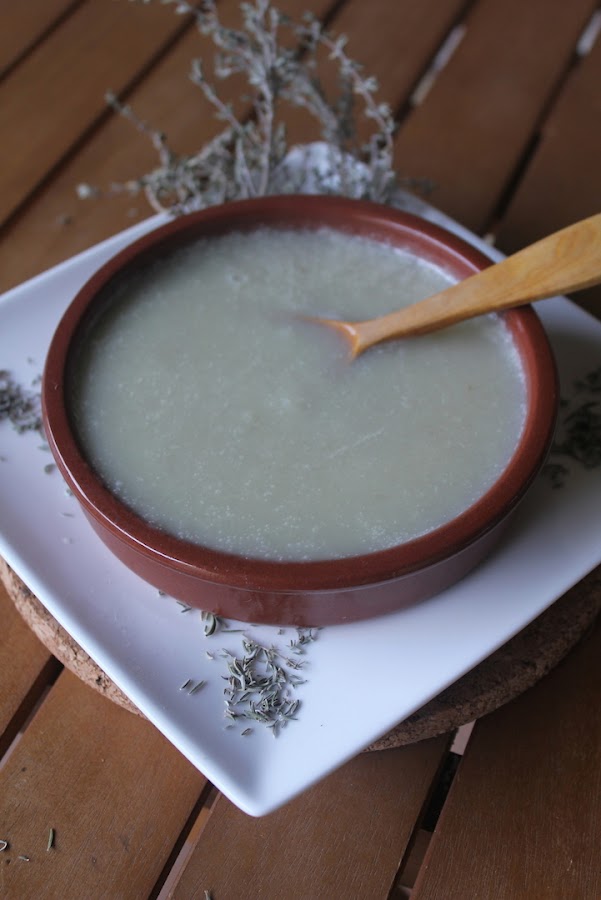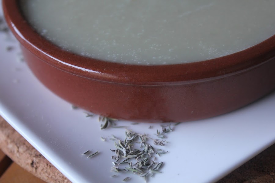 Lava bien el tomillo bajo el agua del grifo y lo colocas en la olla, con la mitad de la cabeza de ajos, pelados, el agua, sal y pimienta, y un chorrito de aceite.