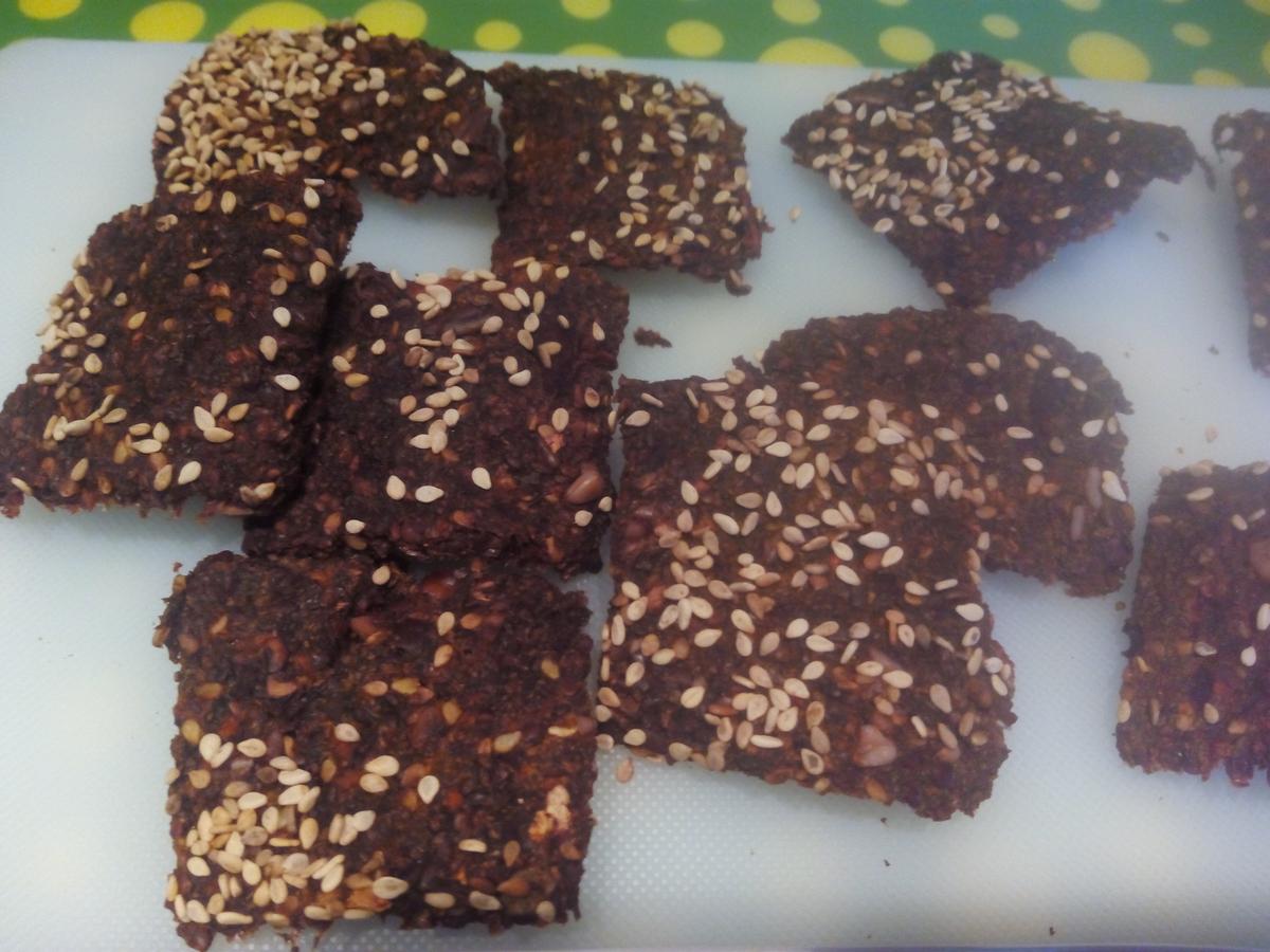 En un bol grande mezclar los diferentes tipos de semillas ya trituradas, la pulpa de verduras y frutas procedente de licuados (yo en este caso utilizé zanahoria, remolacha y jengibre), los condimentos y el agua hasta que consigamos la consistencia de una pasta fácil de extender.