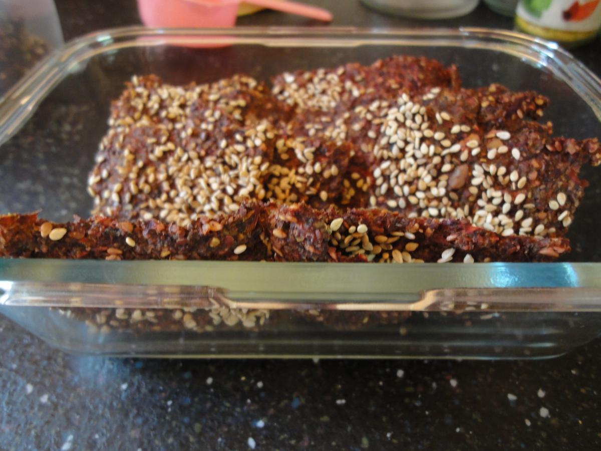 Para la preparación con una deshidratadora, reparte la pasta sobre unas 3 ó 4 bandejas recubiertas con hojas tipo paraflex, Para crackers conviene que la masa tenga un espesor de unos 3mm, y si prefieres utilizarla masa como tostadas o base para pizza es mejor que la pasta tenga un grosor de 6 mm aproximadamente. Deshidratamos durante 2 horas a 47 grados, entonces las sacamos un momento, y con el dorso de un cuchillo marcamos la forma que queramos darle a nuestras crackers, y continuamos deshidratando durante 9 horas más aproximadamente. El tiempo de deshidratado puede variar según el tiempo y la humedad que haga, así como del grosor de la masa. Si después del tiempo de deshidratado notas que a tus crackers les falta mas tiempo dales la vuelta, quita la hoja de paraflex y deshidrata durante mas tiempo.