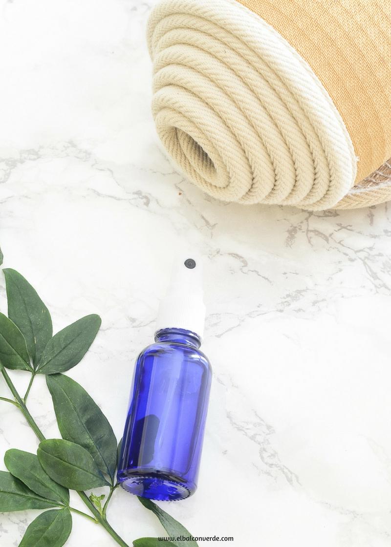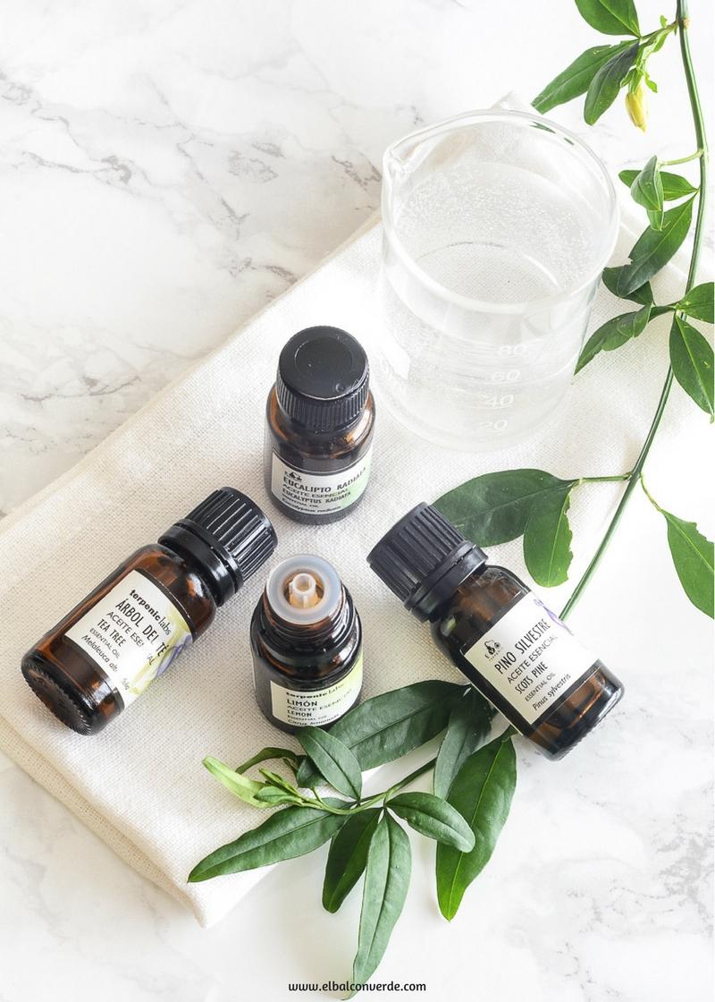 Este spray lleva tres ingredientes que tienes en tu casa seguro: agua destilada, vinagre blanco y alcohol de alta graduación, y no pueden faltar los aceites esenciales más conocidos por su propiedades antibacterianas, limón, eucalipto radiata, árbol de té y pino silvestre que, además, van a dejar un olor a limpio y fresco en tu esterilla.