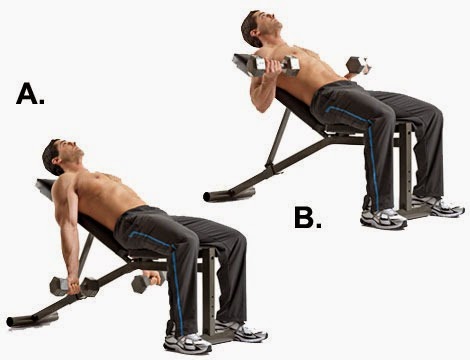 Curl con mancuernas a 45ºTambién sentando en un banco inclinado a 45º. Sujetamos dos mancuernas dejando los brazos colgando, así quedaran hiperextendidos. Flexionaremos los codos levantando las mancuernas hacia los hombros y después bajaremos los brazos con el peso hasta la posición inicial. Tenemos la posibilidad de realizar el ejercicio alternando la ejecución de los brazos.