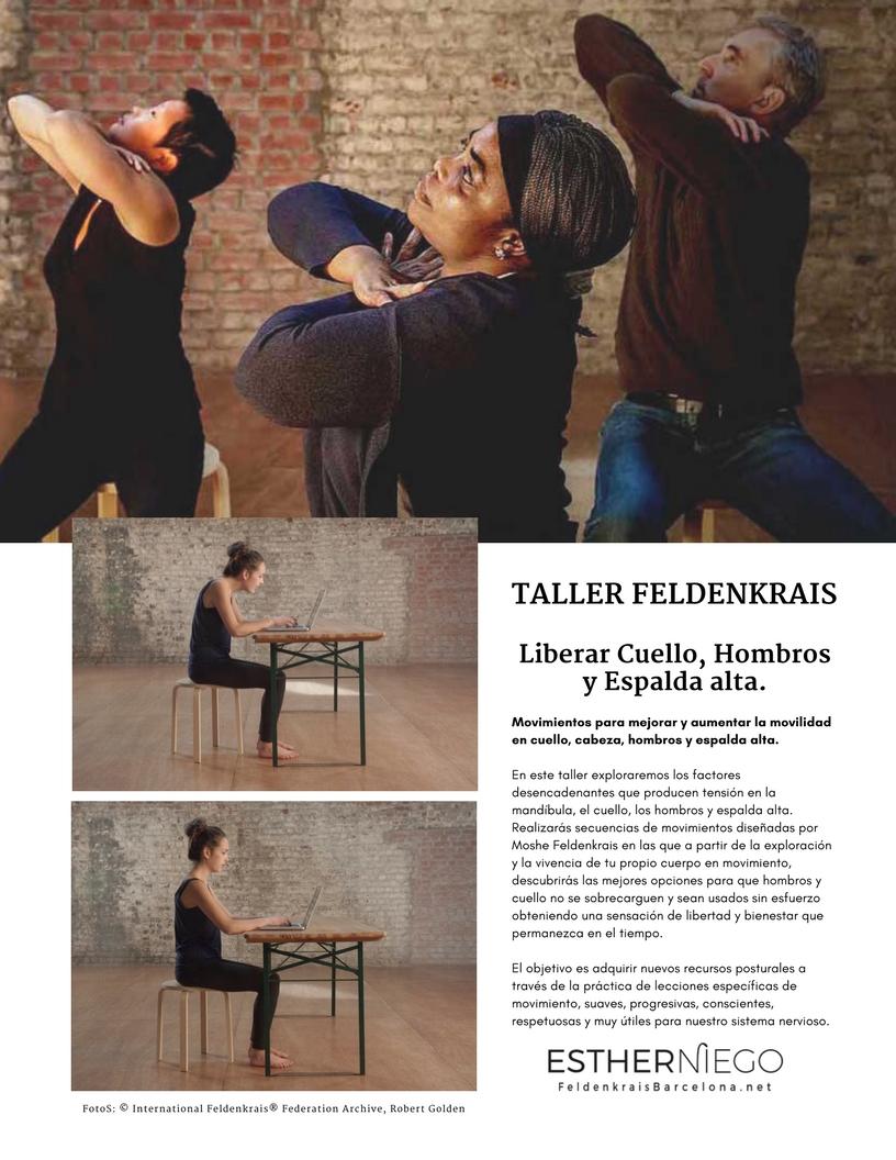 En este taller exploraremos los factores desencadenantes que producen tensión en la mandíbula, el cuello, los hombros y espalda alta. Realizarás secuencias de movimientos, diseñadas por Moshe Feldenkrais, en las que a partir de la exploración y la vivencia de tu propio cuerpo en movimiento, descubrirás las mejores opciones para que hombros y cuello no se sobrecarguen y sean usados sin esfuerzo obteniendo una sensación de libertad y bienestar que permanezca en el tiempo.
