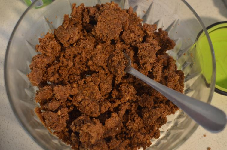 Mezclar la harina, con el aceite de coco derretido, la leche, 1/4 taza de azúcar de coco y 20 gotitas de stevia. Mezclar bien. Luego agregar la linaza remojada y volver a mezclar. Si la masa esta un poco seca agregar unas cucharaditas de agua.