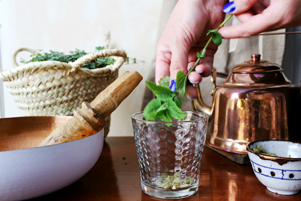 Hierbabuena (menta) como corresponde a un buen té marroquí (té moruno o de menta),