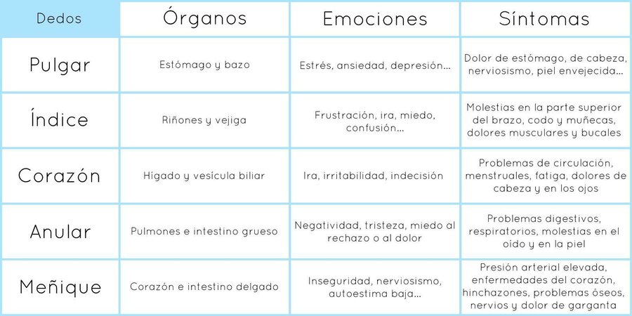 Este "arte" establece una relación entre los dedos y los sentimientos, de tal forma que sujetando y ejerciendo presión con la mano contraria sobre cada uno de ellos, rodeando los dedos de la mano izquierda con el puño derecho cerrado, erradicaríamos las emociones negativas que en la imagen inferior se especifican: