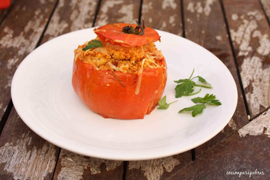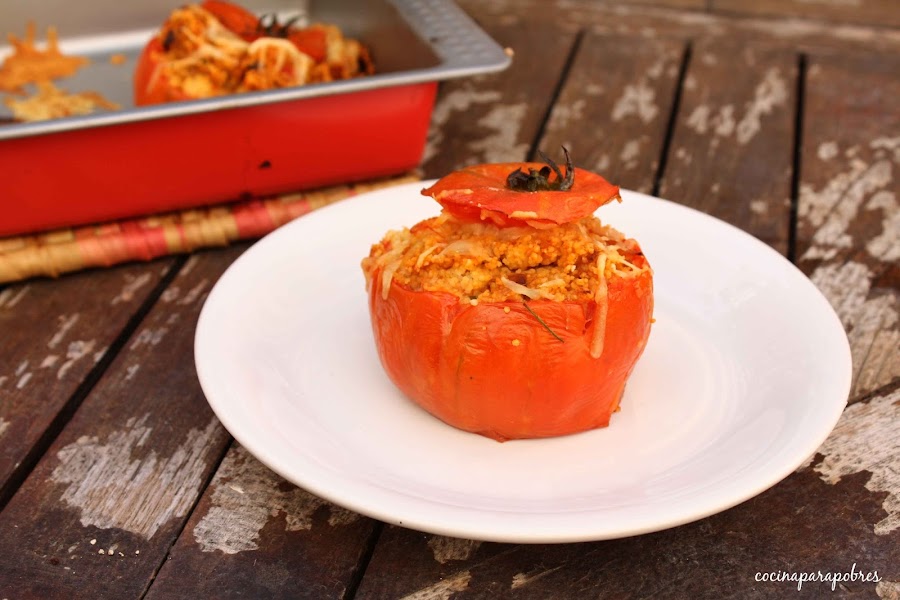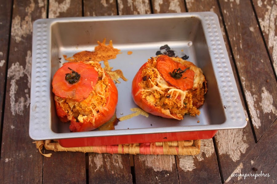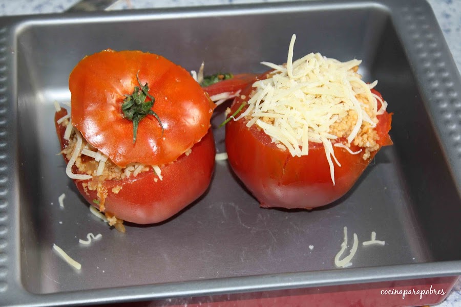 Rellenamos con esta mezcla los tomates, ponemos queso rallado y horneamos a 180 ºC aproximadamente 35 minutos, hasta que veamos los tomates cocinados.