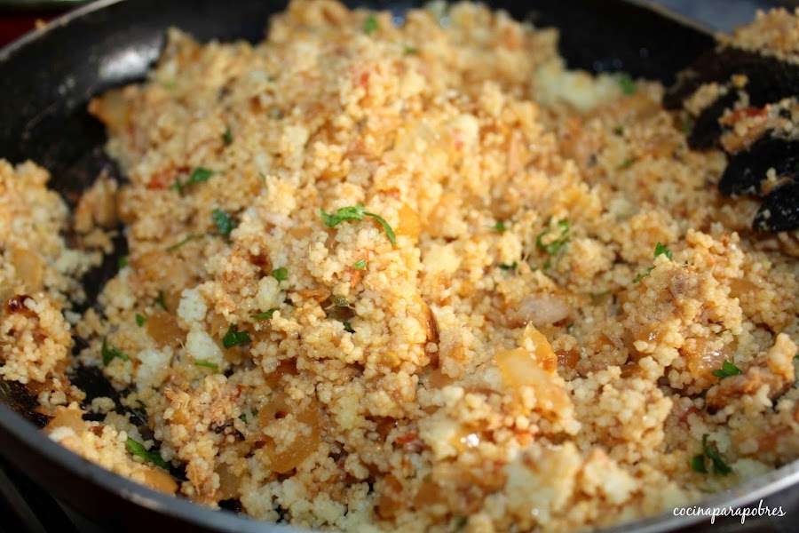 Incorporamos ahora el cous cous , las especias, mezclamos y dejamos al fuego para que se integren los sabores.