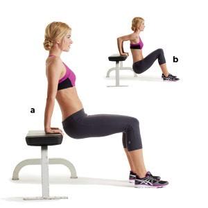 Para realizar los dips de tríceps vas a necesitar una banqueta, el sofá, una mesa o una silla. En este caso nos colocamos de espaldas al sofá, o el material que hayamos elegido, y apoyamos las manos en él. Los dedos de las manos deben mirar hacia nosotros. Lo que tenemos que hacer es flexionar los codos y bajar con la espalda totalmente recta.