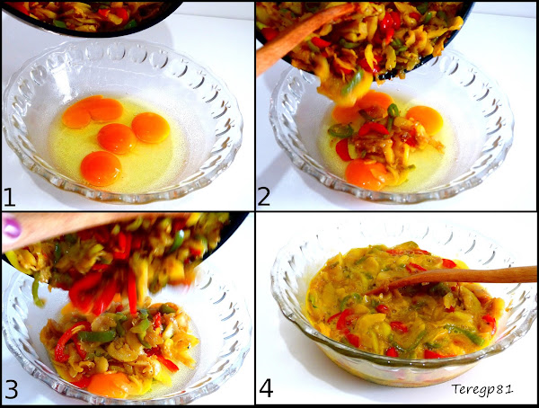Del último paso no he sacado fotos, se hace como cualquier tortilla: en una sartén antiadherente ponemos un poco de aceite en el fondo e incorporamos la mezcla, la vamos cocinando a fuego lento, cuando esté hecha de un lado (yo dejo que se cuaje el huevo casi por completo) le damos la vuelta y cocinamos del otro lado.