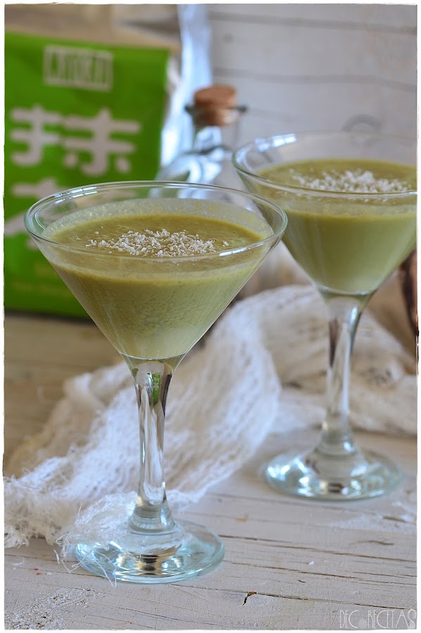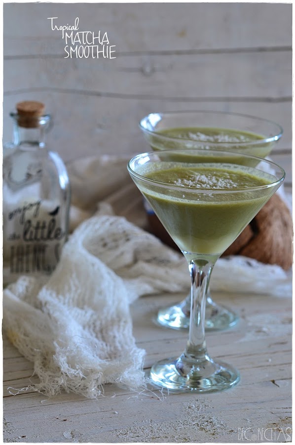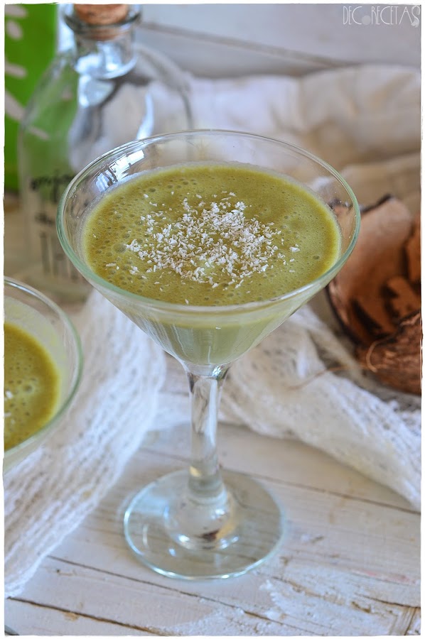 Primero deberemos de abrir el coco cómo os muestro en las imágenes, dándole golpes secos con un martillo y después separando la cáscara dura del interior, para por último lugar pelarlo fácilmente con un cuchillo afilado. Después trituraremos conjuntamente medio coco, con su líquido interior, medio mango en cubos, 2 cucharaditas de té matcha y 200 mililitros de zumo de piña y coco. Espolvoreamos coco rallado por encima para culminar