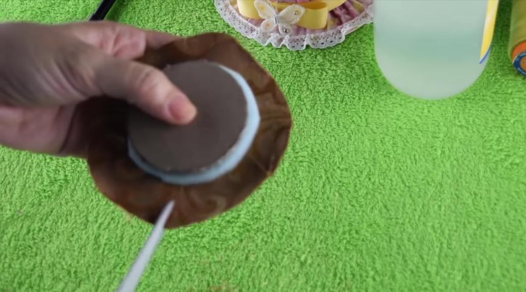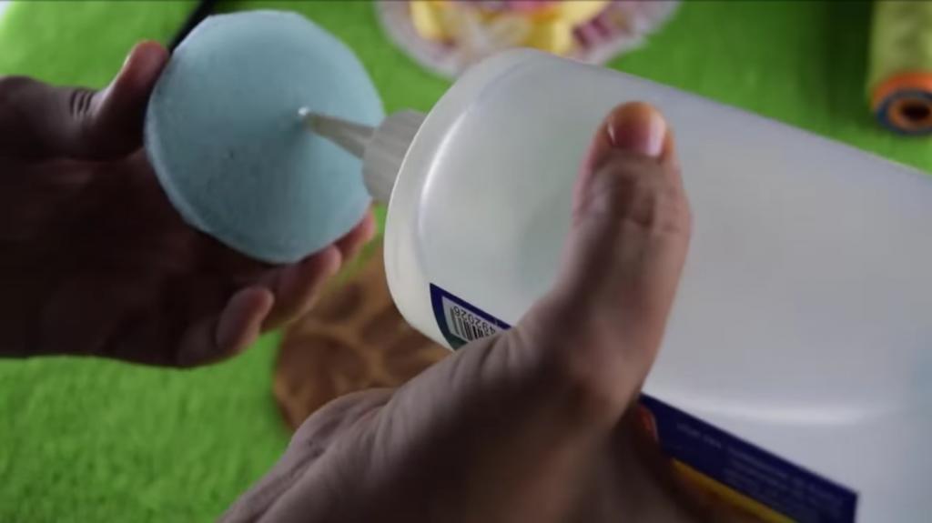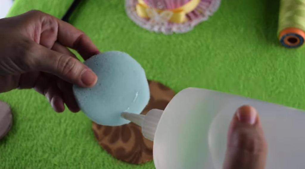 Tomaremos nuestro pegamento de silicón frío y verteremos un poco en la cara principal de esponja fina.