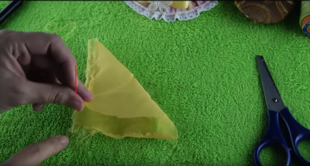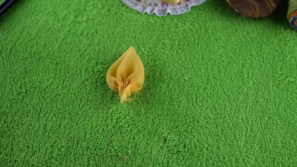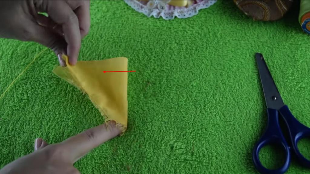Tomaremos la tela que tengamos a la mano, para elaborar los pétalos, cortamos un pequeño cuadrado y esta la vamos a doblar a la mitad pero de forma diagonal.