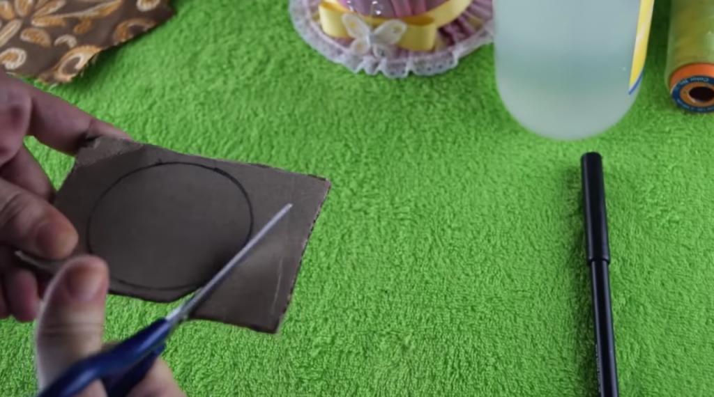 Lo primero que tenemos que hacer es ubicar el trozo de cartón antes mencionado en los materiales sobre una superficie plana y sobre esta ubicaremos el molde circular del que hemos hablado antes, este puede ser la tapa de algún spray, algún vaso de plástico o algún molde circular que tengas en casa, este lo ubicaremos sobre el cartón pero lo más centrado posible.
