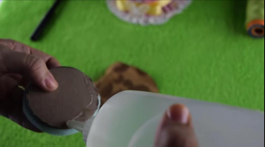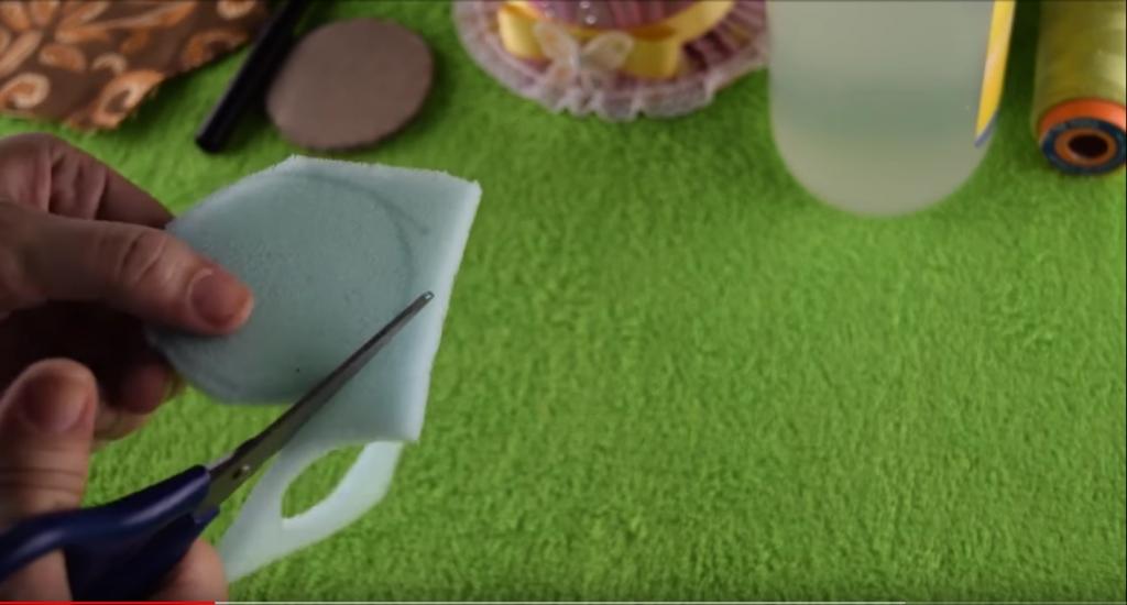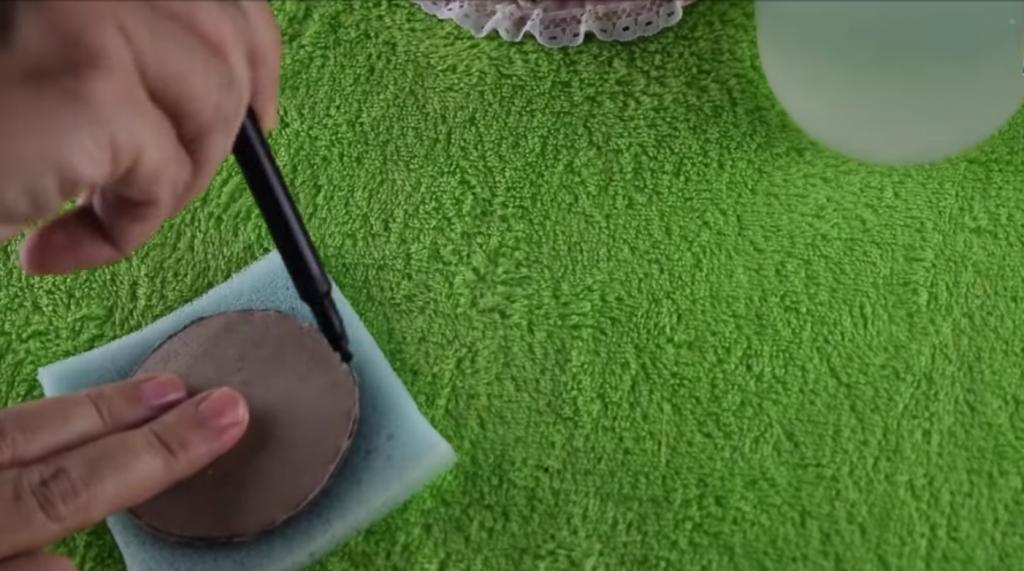 El circulo que hemos recortado anteriormente nos tendría que quedar de la siguiente manera, ahora este, lo vamos a ubicar sobre el pequeño cuadrado de esponja fina (la esponja puede ser del color que prefieras, recomiendo que sea un color que haga contraste), acto seguido, con un marcador convencional vamos a marcar todo el contorno del circulo anteriormente colocado, procura que quede perfecto ya que luego lo vamos a recortar.
