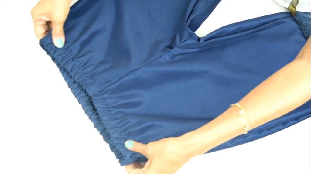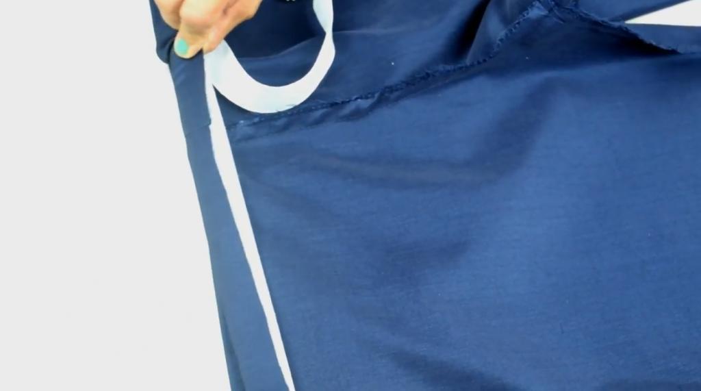 Procedemos a ubicar dicha cinta elástica sobre el borde de la cintura de nuestro mono y doblamos hacia adentro, rápidamente fijaremos con alfileres o pinzas para evitar que se mueva al momento de coser.