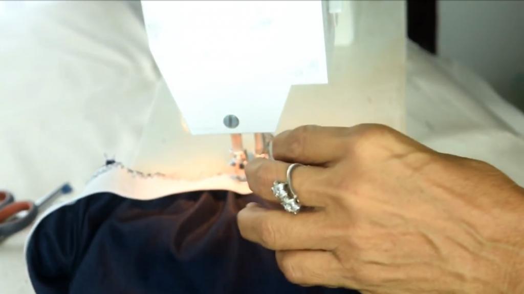Vamos a llevarlo a la máquina de coser y cuidadosamente vamos a realizar un pespunte lineal o sencillo para coser la cinta elástica al borde de la cintura del mono.