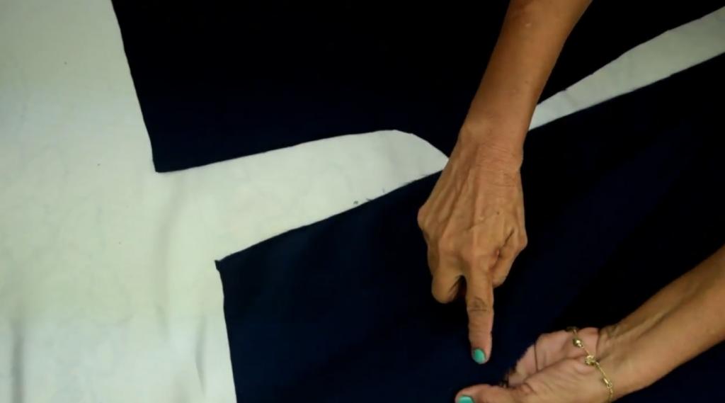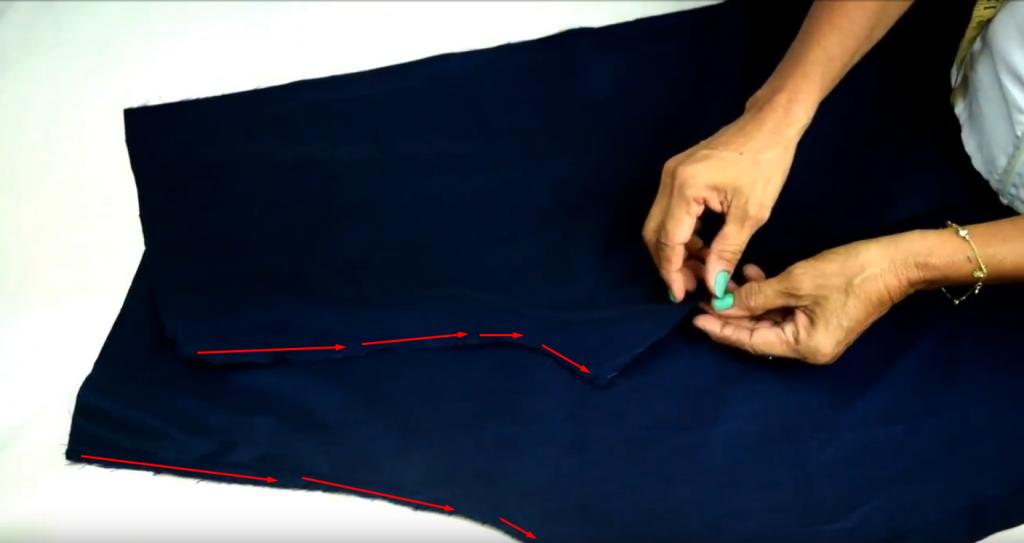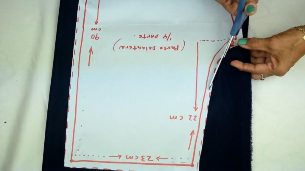 Haremos el mismo procedimiento para la otra parte del patrón, ubicaremos la tela correspondiente sobre una superficie plana y doblada, sobre esta, ubicaremos el patrón correspondiente y fijaremos con alfileres, procedemos a realizar un corte por todo el contorno del patrón con tijeras para tela.