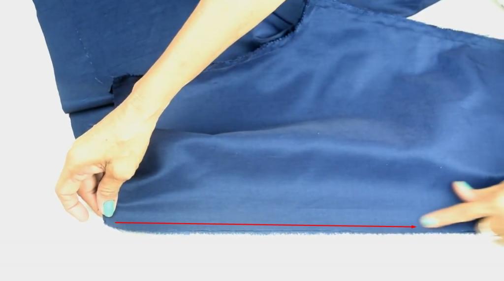 Por último y menos importante vamos a la parte inferior de nuestro mono (talón) y realizamos un doblez hacia adentro de 1 cm aproximadamente, procedemos a fijar con alfileres y realizamos un pespunte lineal o sencillo.