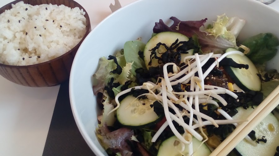 Elegí gohan, que se trata de un bol de arroz y una ensalada con alga wakame, lechuga, escarola, espinacas baby, radiccio, soja germinada, maíz, tomate, pepino.