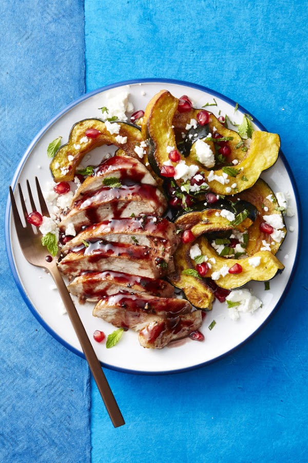 Rocie el pollo con el glaseado. Espolvoree la calabaza con 1/3 taza de semillas de queso feta y granada desmenuzadas y la menta picada antes de servir.