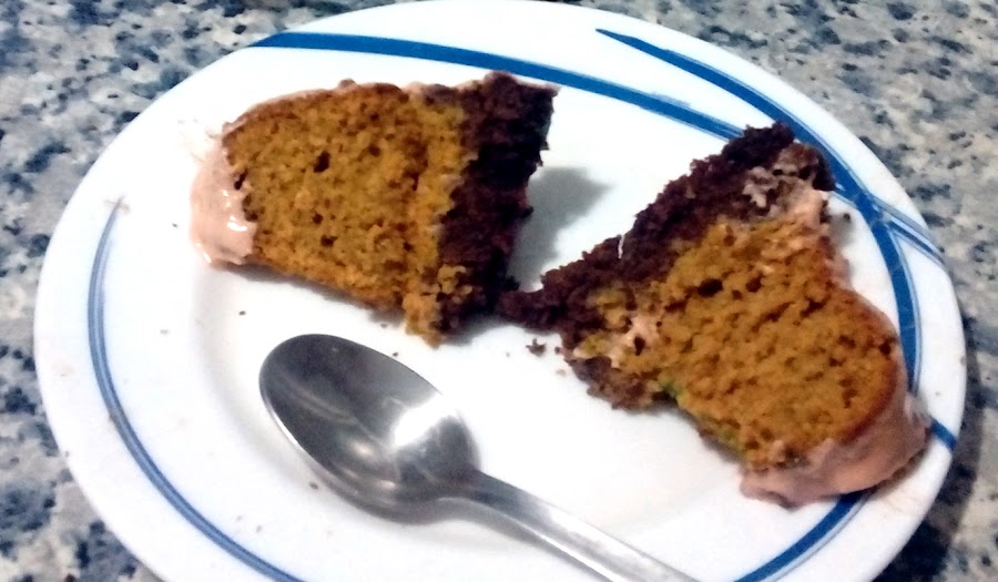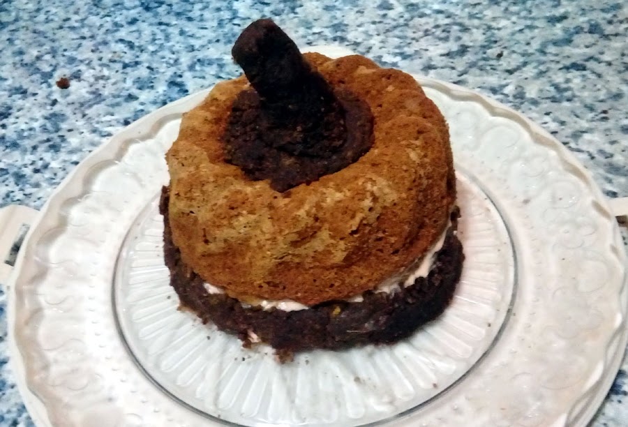 Mi idea era montar los dos bizcochos así formar una calabaza, pero por ser impaciente al desmontar el bizcocho de chocolate todavía caliente se me rompió, ufff. así que tuve que buscar una solución.