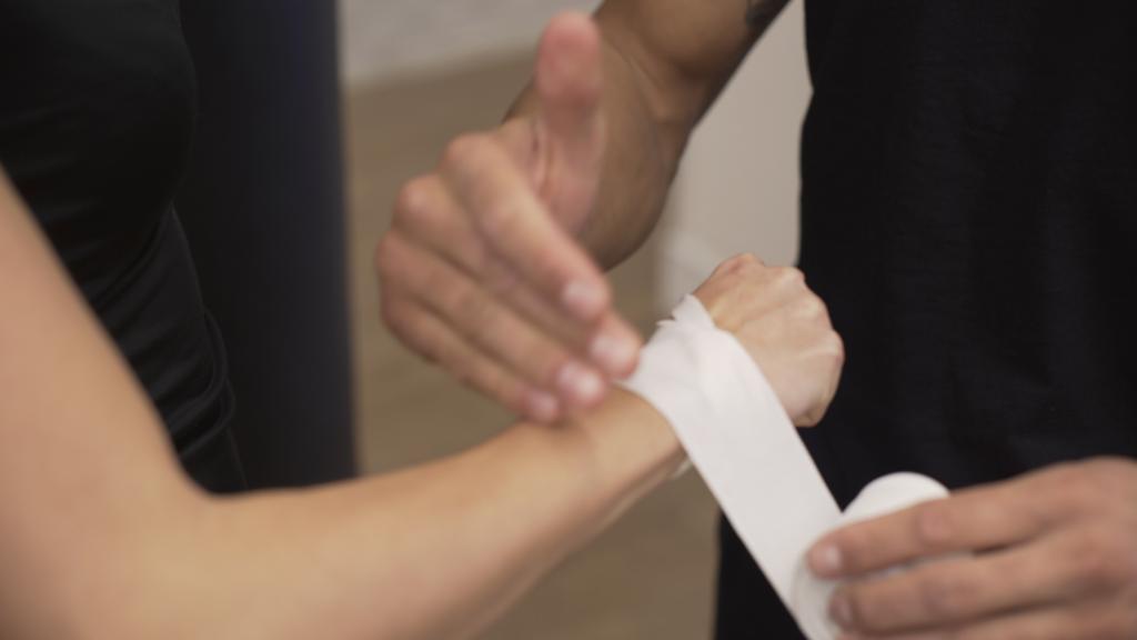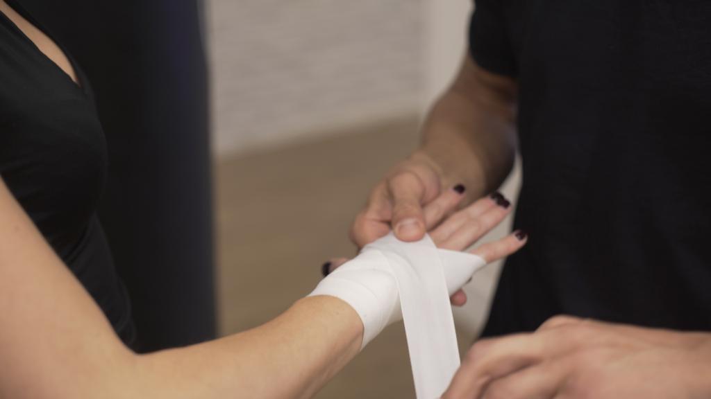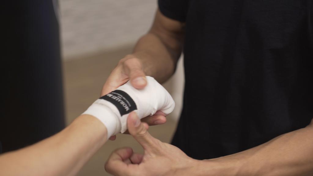 Un vendaje básico de boxeo empieza por sujetar muy bien la muñeca, manteniendo en todo momento antebrazo y puño bien alineados. Pasaremos entre 6 y 8 vueltas con la venda por esta zona (dependiendo de la medida de nuestra venda).