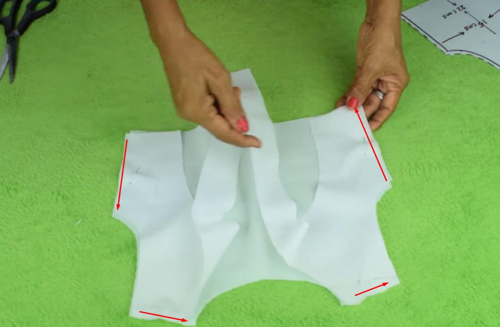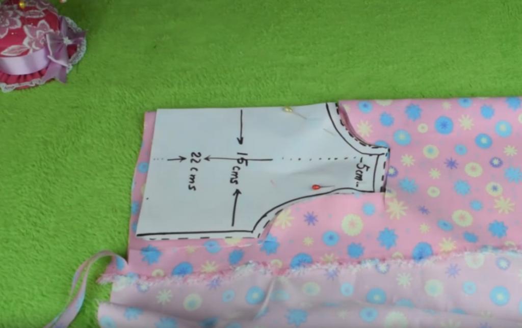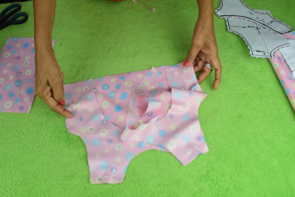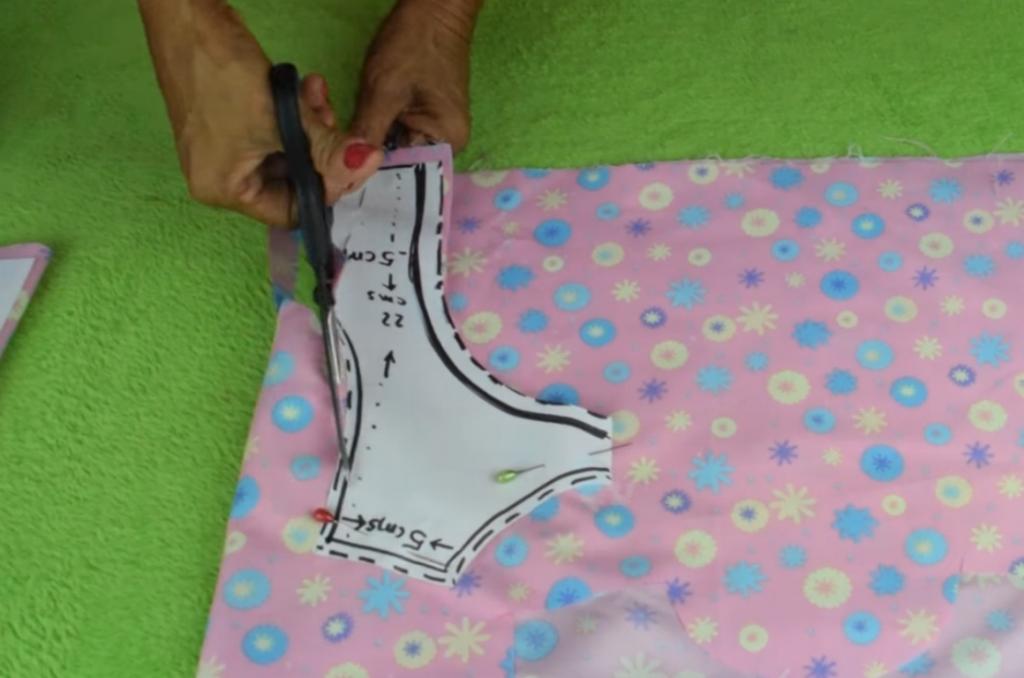 Ahora, vamos a tomar el otro patrón correspondiente y lo ubicamos sobre un sobrante de tela, la doblamos y fijamos con alfileres, procedemos a recortar todo el contorno de la pieza.