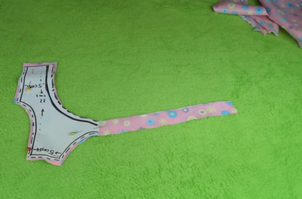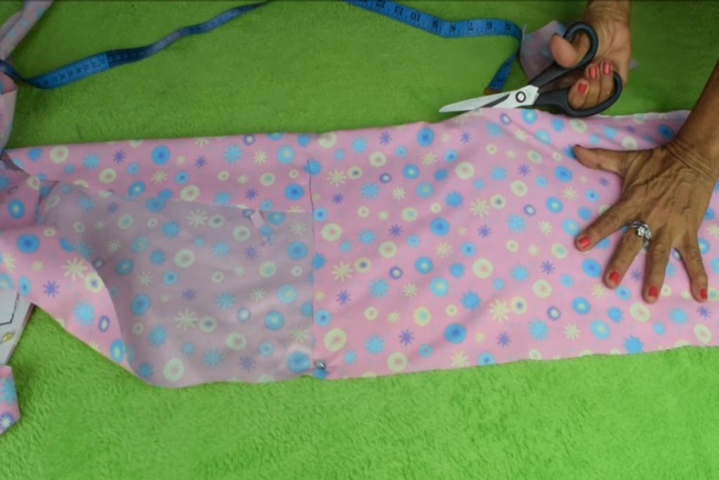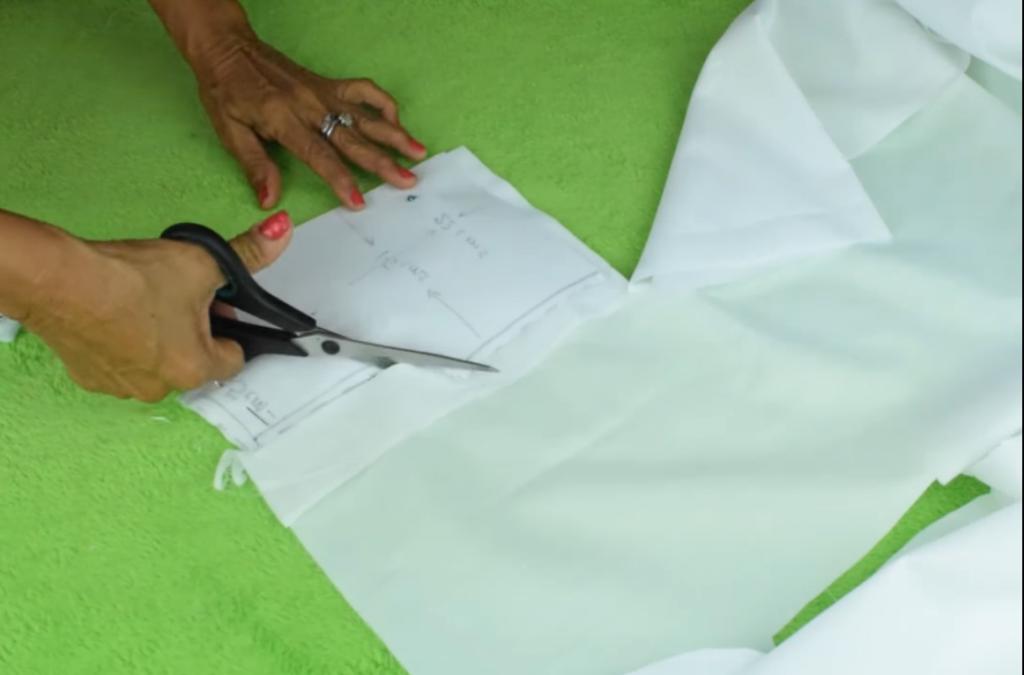 El sobrante de tela lo vamos a ubicar sobre una superficie plana con la tela doblada ubicaremos el otro patrón sobre la tela y fijaremos con alfileres, de tal manera que tomemos nuestra tijeras para tela y recortemos todo su contorno, excepto un lado el cual dejaremos una tira larga.