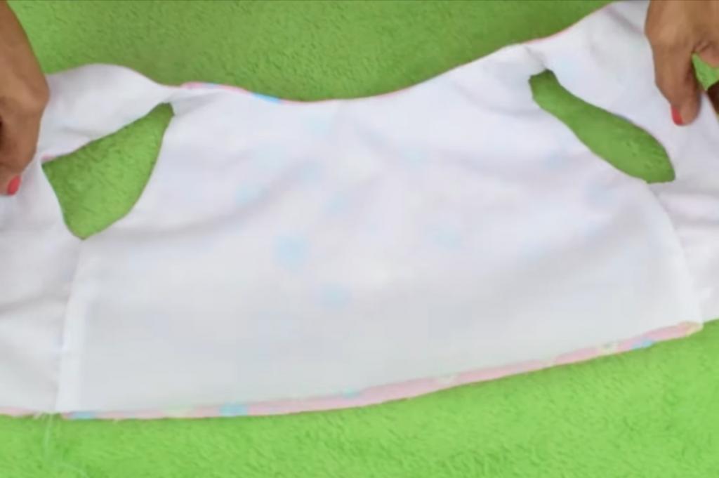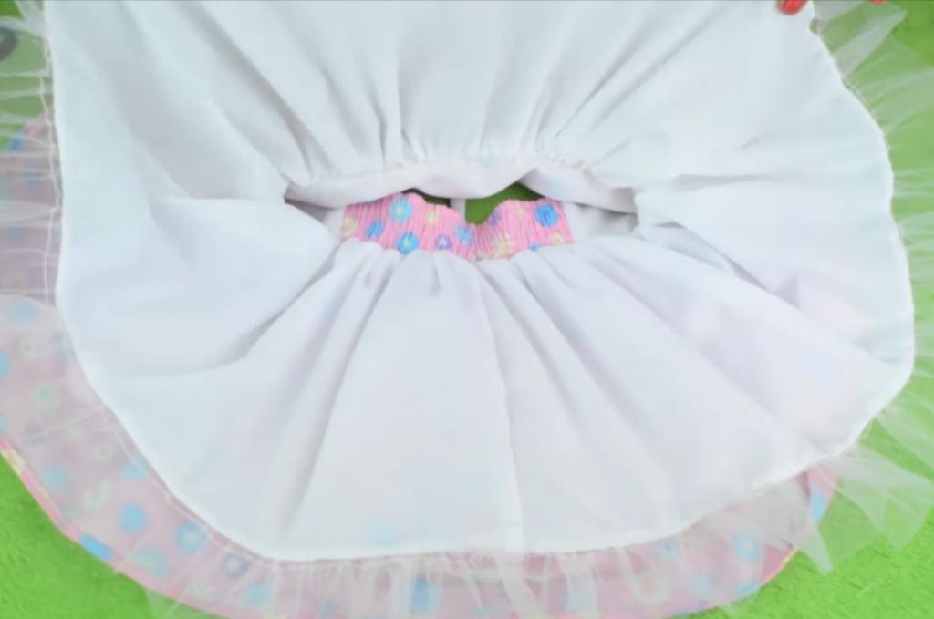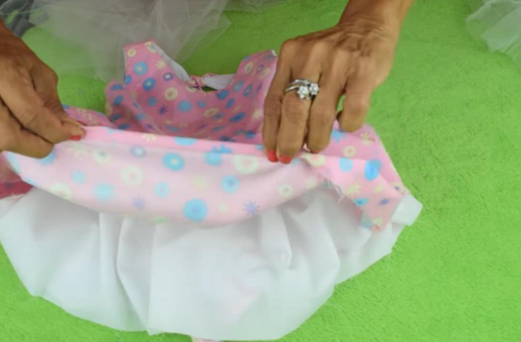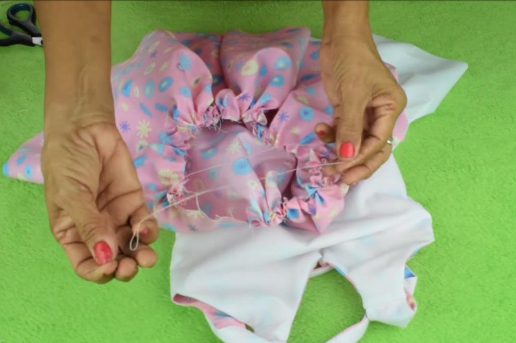 Vamos a colocar la tela mayada la cual servirá para darle un mejor acabado, recortamos, realizaremos un doblez en sus bordes de 3 cm aproximadamente y y de igual manera realizaremos el mismo fruncido que las anteriores piezas y la cosemos, este seria el resultado.