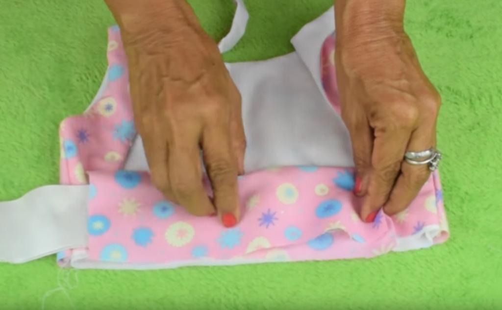 Lo siguiente que haremos será colocar la tela principal dentro de la pieza delantera o superior del vestido y colocamos la tela de forro de la parte inferior del vestido afuera, fijaremos con alfileres.