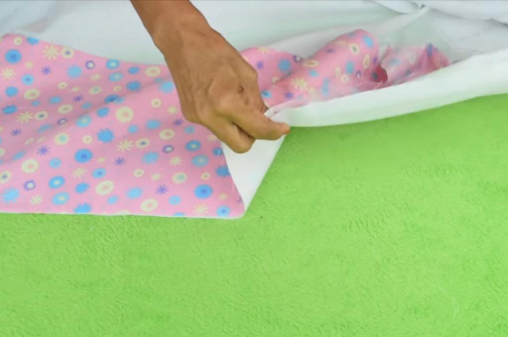 Agarramos la tela sobrante y tomaremos un extremo de esta, formaremos un cuadrado basado en 3 dobleces, recortamos el restante de los laterales y separamos por los bordes con tijeras.