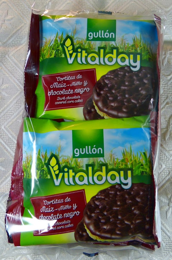 He descubierto hace poco estas tortitas de maíz con chocolate negro, yo las compro en el supermercado Gadis, pero supongo que también habrá en otros porque son de una marca muy conocida, y el precio está por debajo del euro cincuenta, vienen 4 paquetes individuales de 2 tortitas cada uno y están buenísimas. También las hay de arroz, pero yo prefiero éstas.