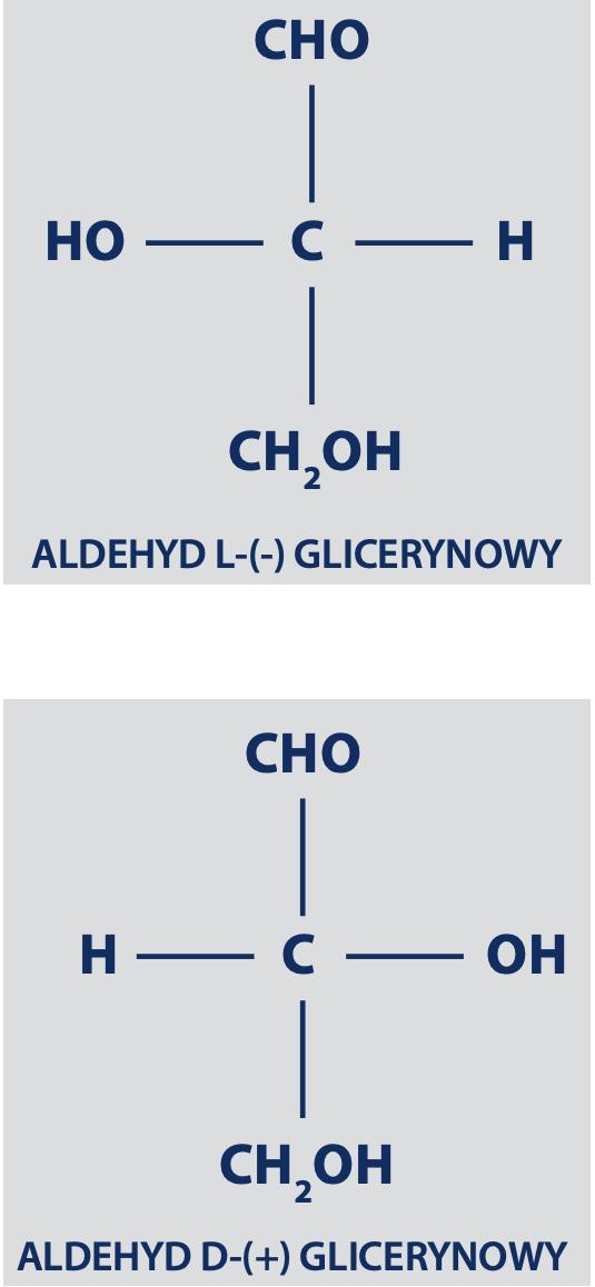 El grupo aldehído (CHO) se encuentra en la “parte superior” del patrón, mientras que el grupo hidroxilo (OH) se coloca a la izquierda (desde el punto de vista del espectador), obteniendo así la fórmula de L – (-) glicerol aldehído presentada en la siguiente figura (arriba), y cuando el grupo hidroxilo se coloca a la derecha obtenemos la fórmula de D- (+) glicerol aldehído (abajo).